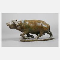 Simbabwe Anfang 20. Jh., fein geäderter afrikanischer Serpentin handbehauen, Darstellung eines majestätischen Kaffernbüffels, auf naturalistisch gestalteter Plinthe, diese mit kleinen Fehlstellen, repariert, L 32 cm.