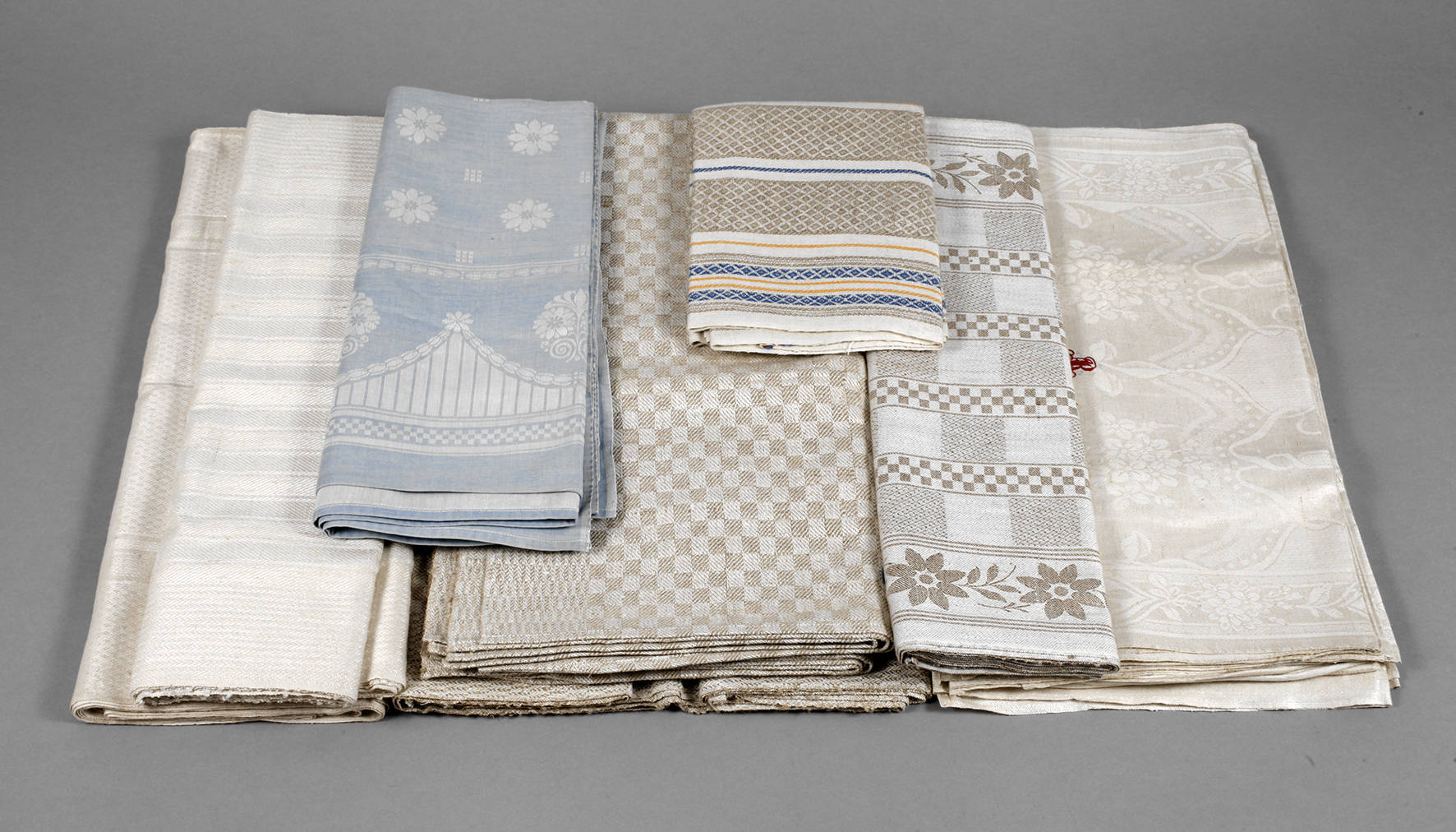 Anfang 20. Jh., cremefarbener Leinen-/Halbleinendamast, bestehend aus einer 12er- und 9er- sowie drei 6er-Gruppen Handtücher sowie einem Tischtuch in Blau-Creme, mit untersch. geometrischen und/oder floralen Dessins, darunter Jugendstilmotive, teils gestickte Monogramme, unbenutzt, Maße Tischtuch 120 x 160 cm.
