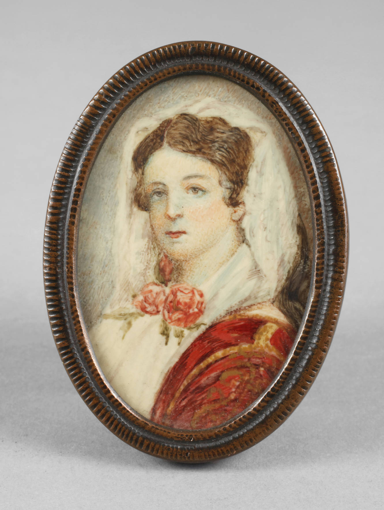 2. Hälfte 19. Jh., unsigniert, Gouache auf Elfenbein, Schulterstück einer jungen Dame mit rosengeschmücktem Tuch, in zartem Messingrahmen gefasst, L 8 cm.