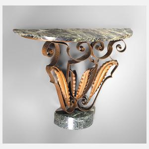 wohl Frankreich, 1930er Jahre, floral gearbeitetes schmiedeeisernes Gestell mit punzierter Oberfläche, Gold bronziert, Sockel und Platte aus schwarz grün geädertem Marmor, H 92 x B 119 x T 36 cm.