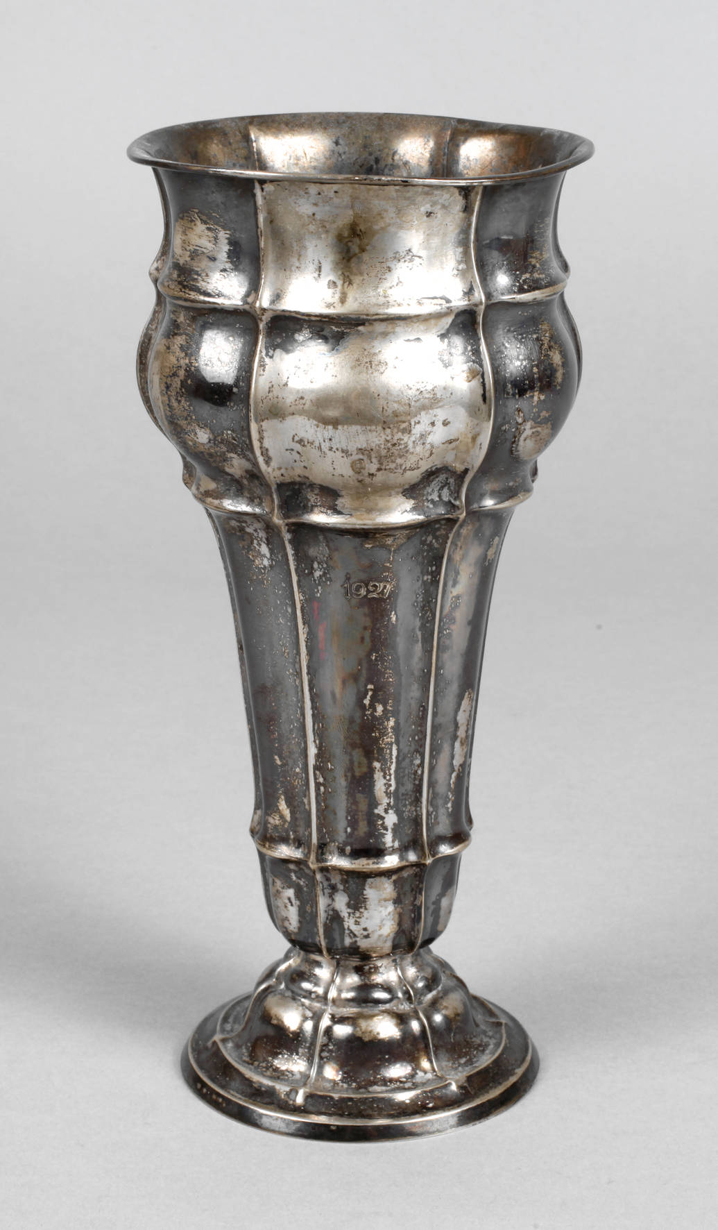 graviert 1927, gestempelt Halbmond Krone 800, gerippte Wandung, normale Altersspuren, H 22 cm, G ca. 253 g.