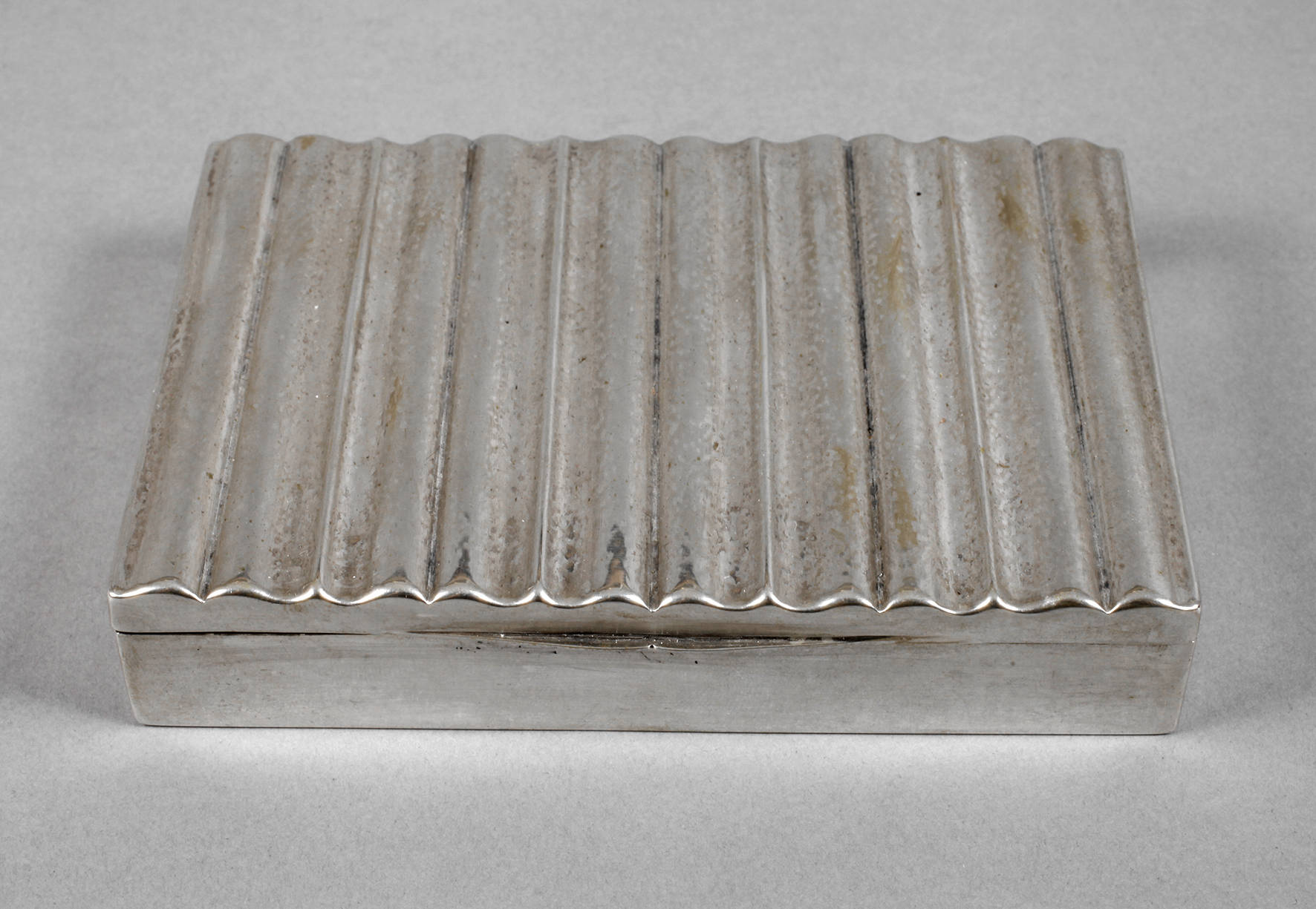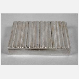 1930er Jahre, gestempelt Halbmond Krone 800, Herstellermarke J.D. Schleißner Soehne Silberwarenfabrik Hanau, rechteckige Dose mit scharniertem Klappdeckel, dieser gerippt und fein martelliert, innen Reste alter Vergoldung, L 12 cm, G ca. 164 g.