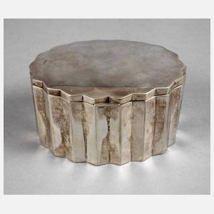 1930er Jahre, gestempelt Halbmond Krone 800, Herstellermarke HB im Wappen, Ovalform mit vertikalen Rippen, scharnierter Klappdeckel, innen vergoldet, gute Erhaltung, L 12,5 cm, G ca. 218 g.