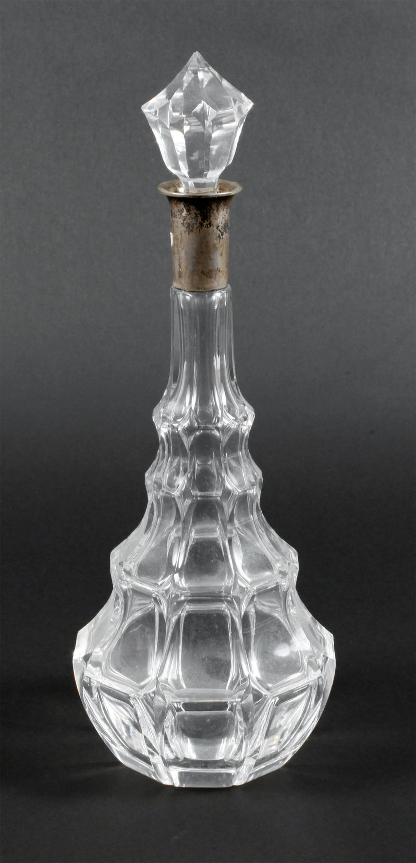 1920er Jahre, gestempelt 800 Halbmond Krone, Herstellermarke KV, Korpus aus klarem Bleikristall, kerbgeschliffen, original Stopfen, leichte Gebrauchsspuren, H 37 cm.