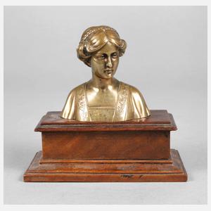 um 1920, unsigniert Bronze goldbronziert, Mädchen mit geflochtener Zopffrisur in einem Kleid mit floraler Bordüre, auf einem getreppten und gekehlten Holzsockel montiert, gute Erhaltung, eine kleine Deformation an der Nase, H Büste 8 cm, H gesamt 12,5 cm. Quelle: Brian Catley ”Art deo an other figures”, 2003, S. 273, dort als Chryselephantine.