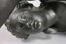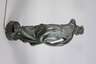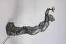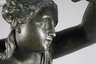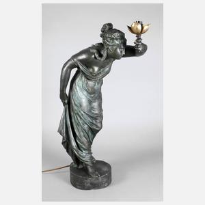 um 1900, unsigniert, Metallguss, grünlich und schwarz patiniert, Darstellung einer Griechin, die Umgebung mit ihrer floral stilisierten Fackel erleuchtend, diese elektrifiziert, auf kleiner runder Plinthe mit Klappe, minimal berieben und kleine Verluste der Patina, Plinthe leicht deformiert, Elektrik erneuert, ohne Schirm, H 81 cm.