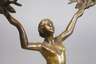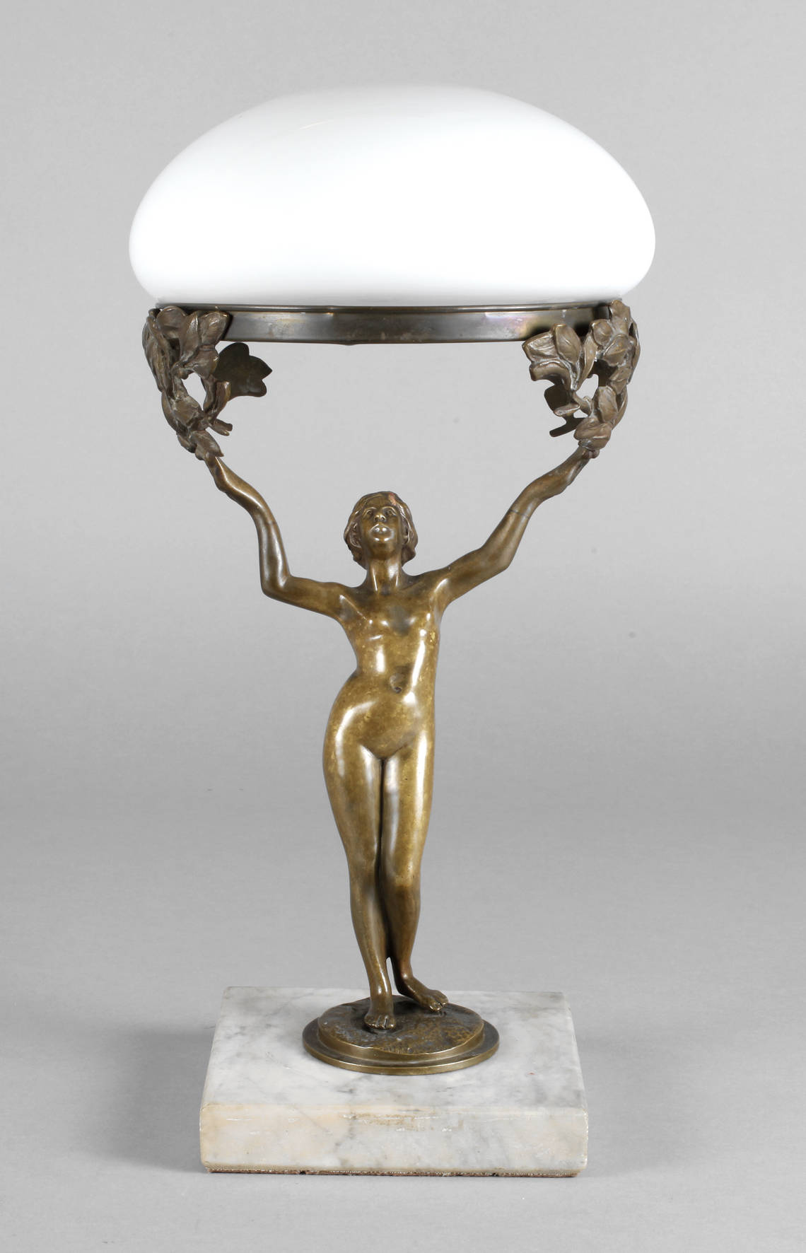 um 1900, unsigniert, Bronze dunkel und golden patiniert, Aktdarstellung einer jungen Frau mit elegantem Haarknoten, die Arme nach oben gestreckt in florale Elemente übergehend, darauf montiert die Halterung für den Lampenschirm aus klarem Glas, weiß unterfangen, dieser ergänzt und nicht ganz passend, auf einer runden naturalistisch gestalteten Plinthe, diese auf einen quadratischen Sockel aus grauem Marmor montiert, Halterung für Lampenschirm etwas unrund sonst gute Erhaltung, Elektrik fehlt, H gesamt, 40 cm.