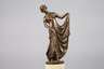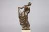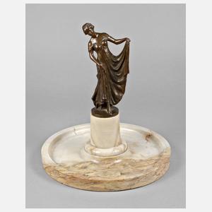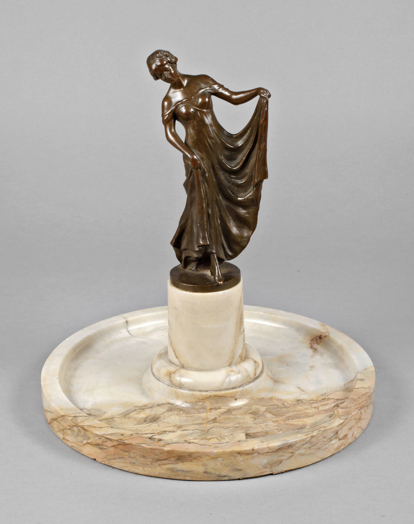 um 1911, auf der Plinthe signiert R. Kaesbach, hinten mit Giesserstempel Ernst Kraas Bildgiesserei Berlin S.O.26., Bronze grünlich patiniert, Mädchen in Tanzpose, ihr Kleid leicht schwingend, auf eine helle Marmorschale montiert, gute Erhaltung, an der Schale zwei leichte Abplatzer, H Figur 20,5 cm, H gesamt 33 cm, D Schale 31 cm. Künsterinfo: Rudolf Kaesbach (München-Gladbach 1873 - 1955 Berlin), besuchte die Akademie Hanau, studierte Bronzeguss in Paris und besuchte danach die Akademie in Brüssel, arbeitete in Düsseldorf und später Berlin. Quelle Thieme/ Becker