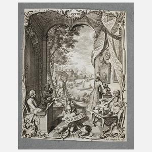 vielfigürliche, allegorische Szene mit eleganter Gesellschaft beim Müßiggang im herrschaftlichen Rokoko- Interieur mit weitem Gartenausblick der Musik eines Orgelspielers lauschend, Kupferstich auf Bütten um 1780, in der Darstellung mit ”COM(M)ODO (Charakterisierung des musikalischen Vortrags: in bequemem Tempo)” bezeichnet, rechts unten in der Platte signiert ”J. Rod. Holtzhalb del. et sc.”, auf die Darstellung beschnitten und auf grauen Unterlagekarton montiert, ungerahmt, Blattmaß ca. 18 x 14,5 cm. Künstlerinfo: schweizer Kupferstecher, Zeichner, Illustrator, Exlibriskünstler und Verleger (1723 Zürich bis 1806 Zürich), Schüler von David Herrliberger, weitergebildet in Augsburg und Erlangen, ab 1746 in Zürich tätig, versah 1785-98 das Amt des Landvogtes in Knonau, Quelle: Thieme-Becker und Sikart.