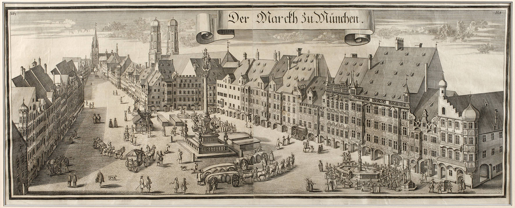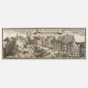 Ansicht des Marktes in München aus der Vogelschau mit der Frauenkirche im Hintergrund, oben in Schriftband betitelt „Der Marckh zu München”, Kupferstich, wohl Abzug des 18. Jh., unsigniert, Druck auf zwei zusammengesetzten Büttenbögen, Altersspuren, unter Passepartout hinter Glas gerahmt, Passepartoutausschnitt ca. 28 x 70,5 cm. Künstlerinfo: dt. Kupferstecher (1645 Nürnberg bis 1718 München), seit 1666 in München tätig, zunächst Fourier am bayrischen Hof, 1669 Ernennung zum Hofkupferstecher von Kurfürst Ferdinand Maria von Bayern und 1680 Ernennung zum kurfürstlichen Ritterstubenportier, tätig in München, Quelle: Thieme-Becker und Internet.