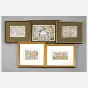 1. „Krichisch Wyssenburg“ das ist Belgrad in Serbien, Holzschnitt von Sebastian Münster, 2. Ansicht einer Stadt mit Therme an der Donau, Holzschnitt, wohl aus Sebastian Münster, 3. Landkarte Darstellung des Gebietes zwischen Island, England, Skandinavien, Kupferstich, in der Platte bezeichnet „SCHONLA DIA NOVA“, 4. Landkarte Osteuropa, Kupferstich, in der Platte bezeichnet „POLONIA HVGARIA NOVA TABULA“, 5. Plan der Stadt Stralsund, Kupferstich, aus Mathäus Merian „Theatrum Europaeum“, jeweils handkoloriert, verschiedene Erhaltungszustände, unter Passepartout gerahmt, Falzmaß max. 34,0 x 38,5 cm.