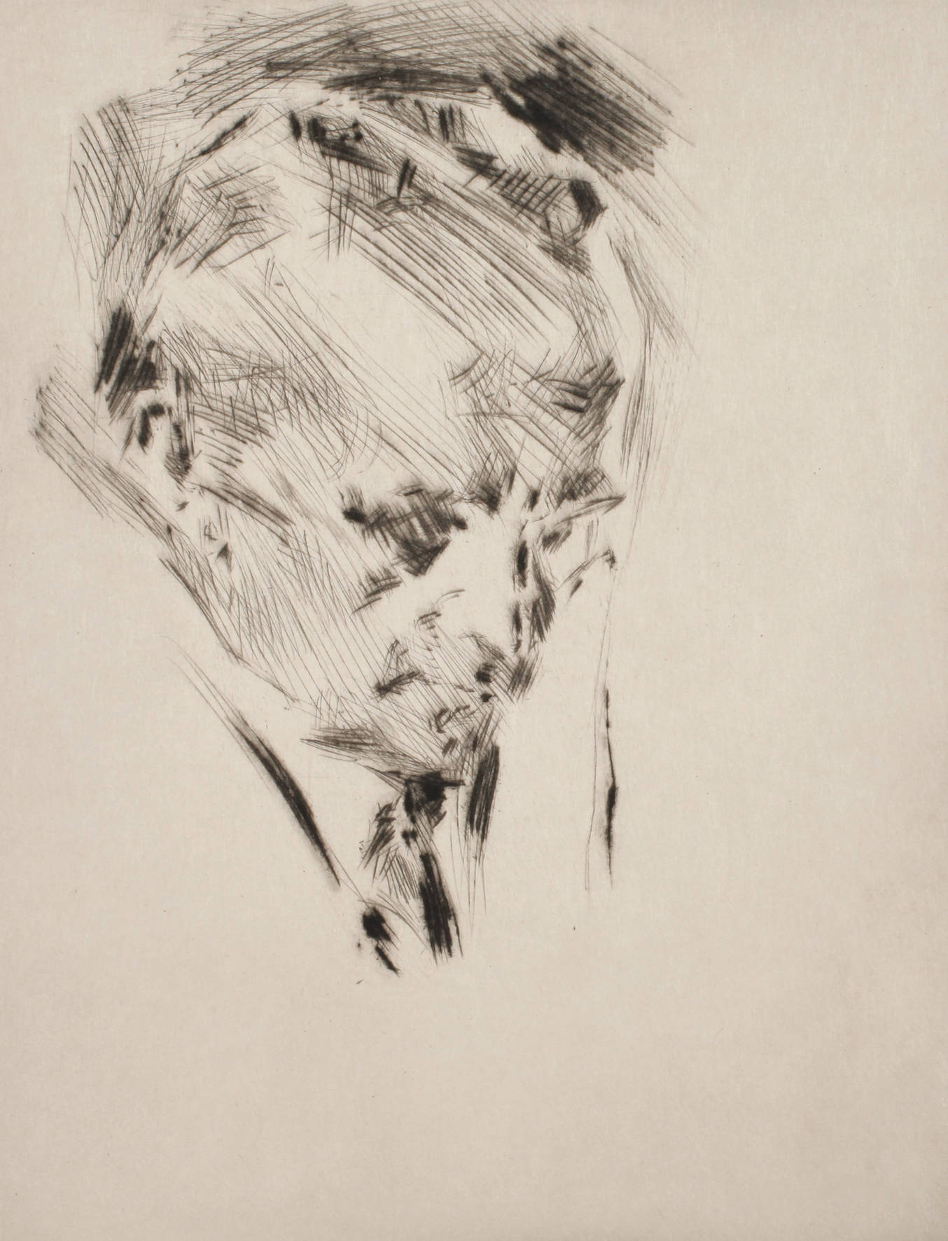 Kopfbildnis eines Mannes mit gesenktem Haupt, flott erfasste gratige Radierung um 1915, rechts unter der Platte in Blei handsigniert ”Wilhelm Funk”, im Passepartout ungerahmt, Plattenmaß ca. 20 x 15,5 cm. Künstlerinfo: eigentlich Wilhelm Heinrich Funk, dt.-amerikanischer Maler, Illustrator, Karikaturist und Radierer (1866 Hannover bis 1949 München), studierte in München und an der Art Students´League in New York, ab 1885 in New York tätig, lieferte Beiträge für die Münchner Zeitschrift ”Jugend”, beschickte ab 1905 die Ausstellungen der Société des artistes francais, Ausstellungen in Pittsburgh sowie ab 1914 den Glaspalast München, um 1920 wieder in München ansässig, 2. Präsident der Münchner Künstlergenossenschaft, Quelle: Thieme-Becker, Vollmer, Dressler und Internet.