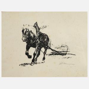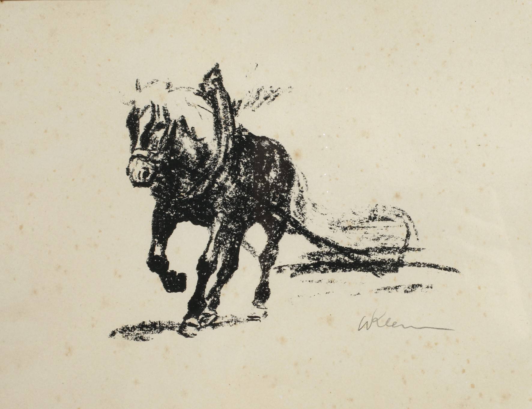 Darstellung eines Pferdes bei der Feldarbeit, Litho um 1920, rechts unten in Blei handsigniert ”W. Klemm”, gering gegilbt und stockfleckig, hinter Glas gerahmt, Abbildung ca. 12 x 14 cm. Künstlerinfo: dt. Maler, Graphiker und Illustrator (1885 Karlsbad [Karlovy Vary] bis 1957 Weimar), Studium an der Kunstgewerbeschule und der Akademie Wien bei Anton von Kenner, Kolo Moser, F. Myrbach und anderen, 1905 Beteiligung an Ausstellung der Wiener Secession und Übersiedlung nach Prag, 1906 Ateliergemeinschaft mit Carl Thiemann in Libotz bei Prag, ab 1908 in der Künstlerkolonie Dachau, 1910 Mitglied der Berliner Sezession, 1913 Berufung als Professor an die Akademie Weimar, Quelle: Thieme-Becker, Vollmer, Eisold ”Künstler in der DDR”, Dressler und Internet.