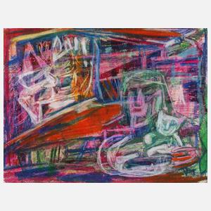 farbintensive Ölpastellzeichnung, links unten monogrammiert und datiert „HG 20.12.(19)70“, rückseitig Montierungsspuren, ungerahmt, Blattmaß ca. 24 x 31,5cm. Künstlerinfo: dt.-jüdische Malerin und Graphikerin (1897 Leipzig bis 1980 Kitzbühel), Kindheit in Leipzig, studierte 1914-17 an der Akademie Leipzig bei Hugo Steiner-Prag und Tanzunterricht nach der Methode von Emile Jaques-Dalcroze, ab 1918 Privatschülerin von Otto Richard Bossert, ab 1919 Ballettunterricht an der Oper Leipzig und Gestaltung von Bühnenbildern, ab 1920 Studium an der Akademie Dresden bei Otto Hettner und hier 1921-23 Schülerin von Oskar Kokoschka, 1923 Studienreise in die USA, 1926-27 Studium an der Académie Colarossi in Paris, Studienaufenthalte in Südfrankreich, 1928 Aufenthalt in Rom, Florenz und auf Capri, ab 1932 in München ansässig, 1933 Übersiedlung von Leipzig nach Kitzbühel, 1939-50 Emigration nach England, 1950 Rückkehr nach Kitzbühel, 1954 erste Teilnahme und ab 1955 Lehrerin an der Internationalen Sommerakademie Salzburg, 1956-72 regelmäßige Aufenthalte in Venedig, 1968 Reise nach Israel, 1974 Ehrung mit dem Professorentitel, Quelle: Vollmer, Dressler, Wikipedia und Internet.