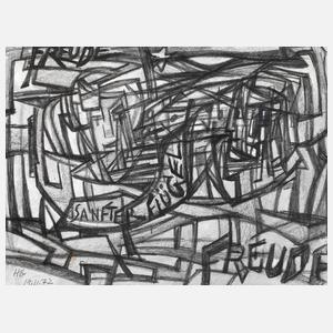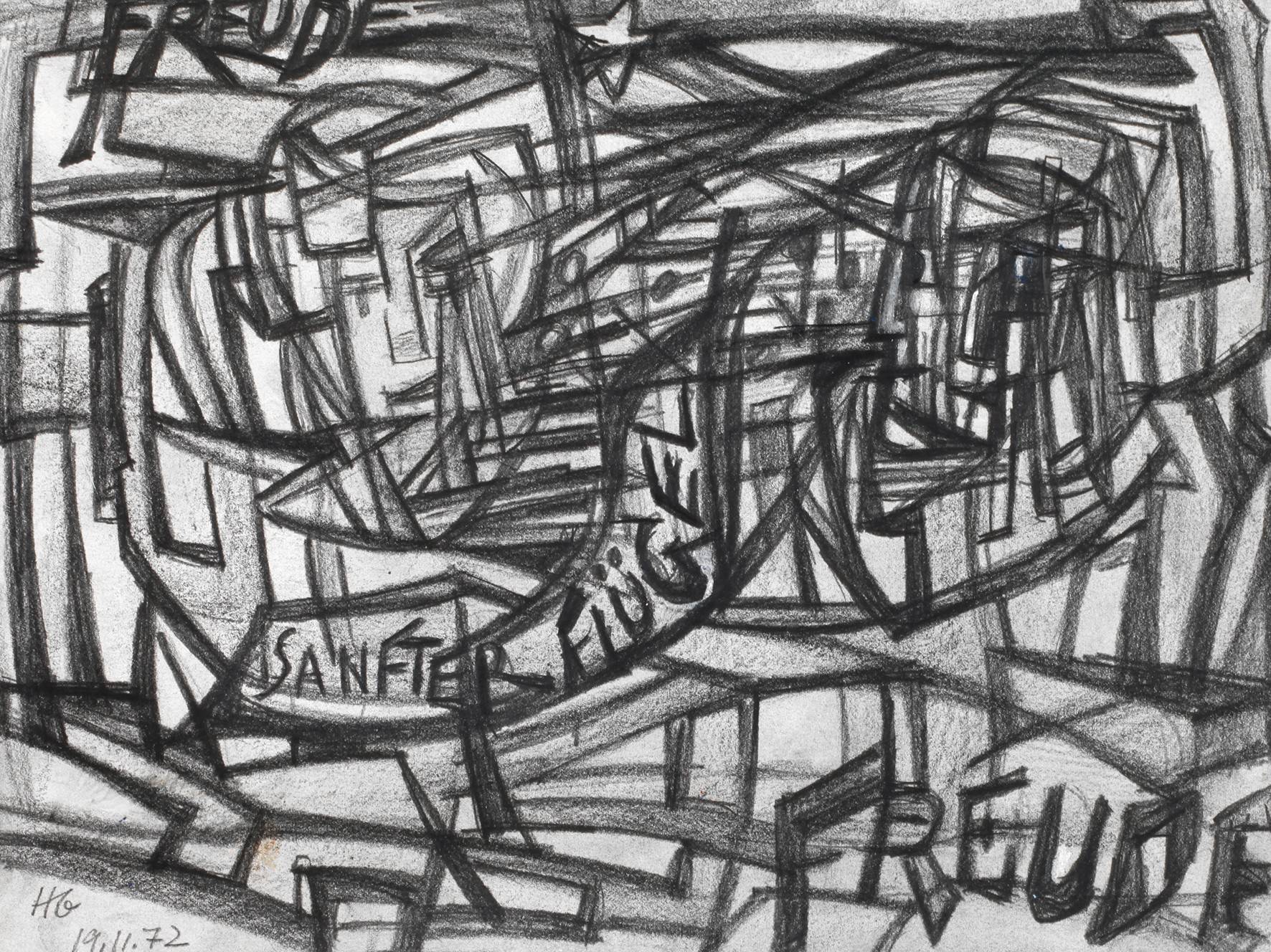 in Darstellung Schriftzug eingearbeitet „Freude sanfter Flügel Freude“, Grafitzeichnung, partiell weiß gehöht, unten links in Blei monogrammiert und datiert „HG 19.11.(19)72“, leichte Altersspuren, ungerahmt, Blattgröße ca. 24 x 31,5 cm. Künstlerinfo: dt.-jüdische Malerin und Graphikerin (1897 Leipzig bis 1980 Kitzbühel), Kindheit in Leipzig, studierte 1914-17 an der Akademie Leipzig bei Hugo Steiner-Prag und Tanzunterricht nach der Methode von Emile Jaques-Dalcroze, ab 1918 Privatschülerin von Otto Richard Bossert, ab 1919 Ballettunterricht an der Oper Leipzig und Gestaltung von Bühnenbildern, ab 1920 Studium an der Akademie Dresden bei Otto Hettner und hier 1921-23 Schülerin von Oskar Kokoschka, 1923 Studienreise in die USA, 1926-27 Studium an der Académie Colarossi in Paris, Studienaufenthalte in Südfrankreich, 1928 Aufenthalt in Rom, Florenz und auf Capri, ab 1932 in München ansässig, 1933 Übersiedlung von Leipzig nach Kitzbühel, 1939-50 Emigration nach England, 1950 Rückkehr nach Kitzbühel, 1954 erste Teilnahme und ab 1955 Lehrerin an der Internationalen Sommerakademie Salzburg, 1956-72 regelmäßige Aufenthalte in Venedig, 1968 Reise nach Israel, 1974 Ehrung mit dem Professorentitel, Quelle: Vollmer, Dressler, Wikipedia und Internet.