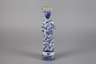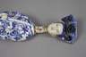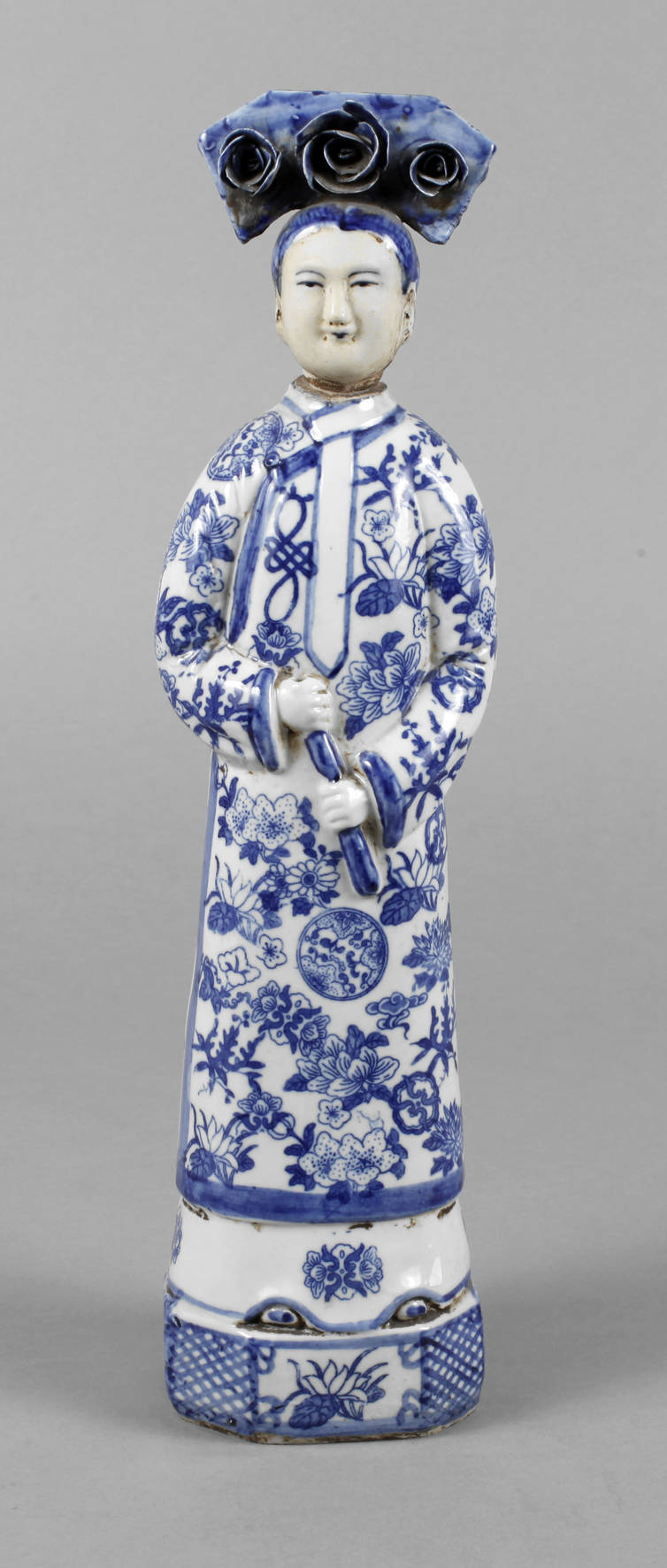 China, Anfang 20. Jh., am Boden mit Zehnzeichen Prägemarke, Porzellan in kobaltblauer Unterglasurbemalung, stehende weibliche Gestalt im langen floral verzierten Gewand auf polygonal facettierter Plinthe, beweglich gelagerter Kopf mit Blütenschmuck, brandfleckig, wohl nicht ganz komplett, H 38,5 cm.