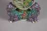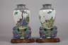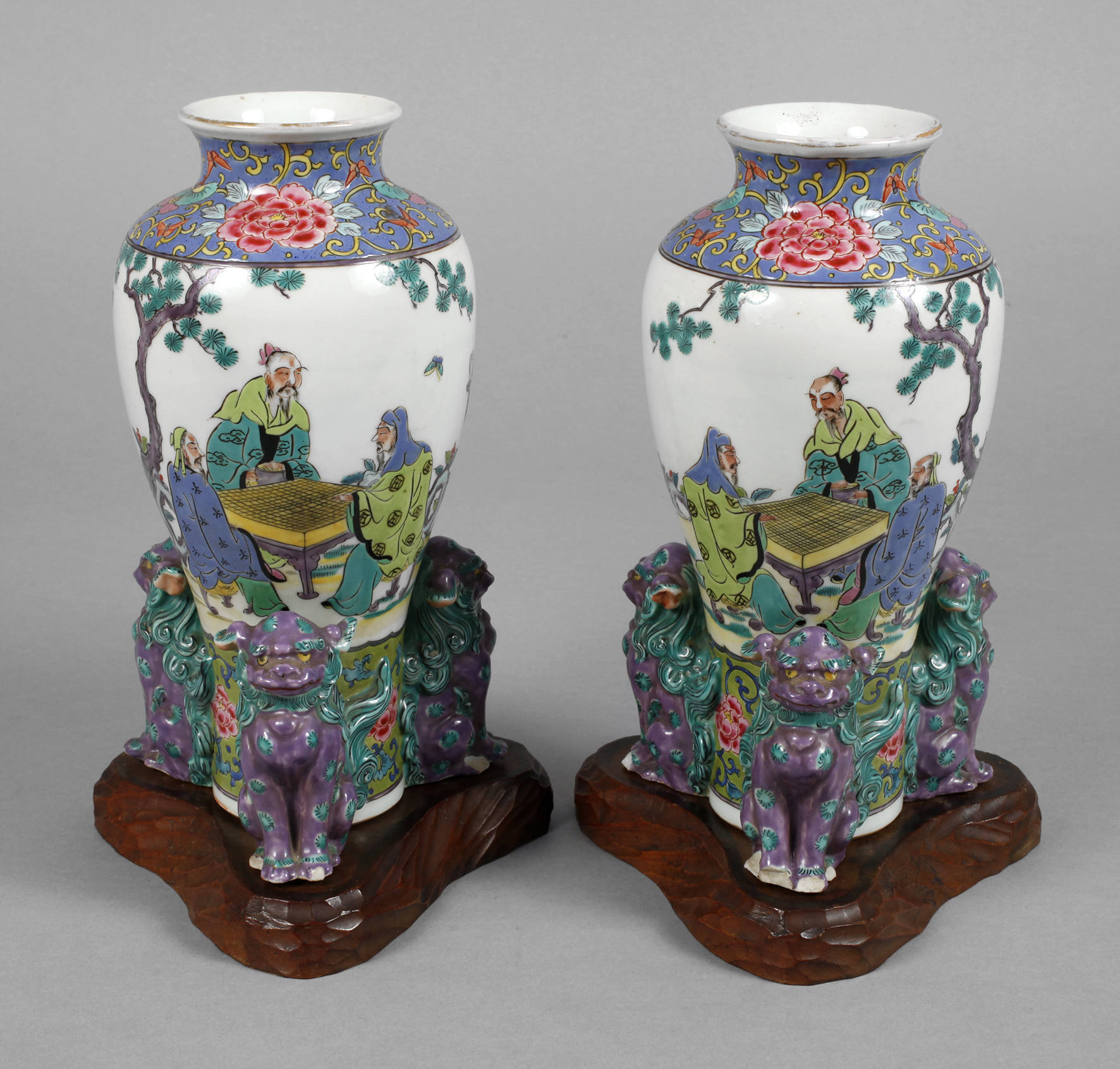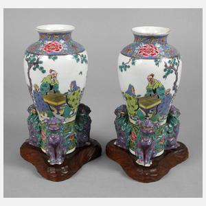 China, um 1920, am Boden mit roter Pinselmarke., Weißporzellan in polychromer Emailbemalung, schlanker Stand mit drei vollplastisch gearbeitetem Wächterlöwen, leicht gebauchte Kopera mit kurzem Hals und ausschwingernder Mündung, Wandung umlaufend bemalt mit figürlichen Darstellungen, gerahmt von floralen Bordüren, auf geschnitztem Tropenholzsockeln, Pfoten der Löwen teilweise mit Fehlstellen, Vergoldung berieben, H gesamt je 26 cm.