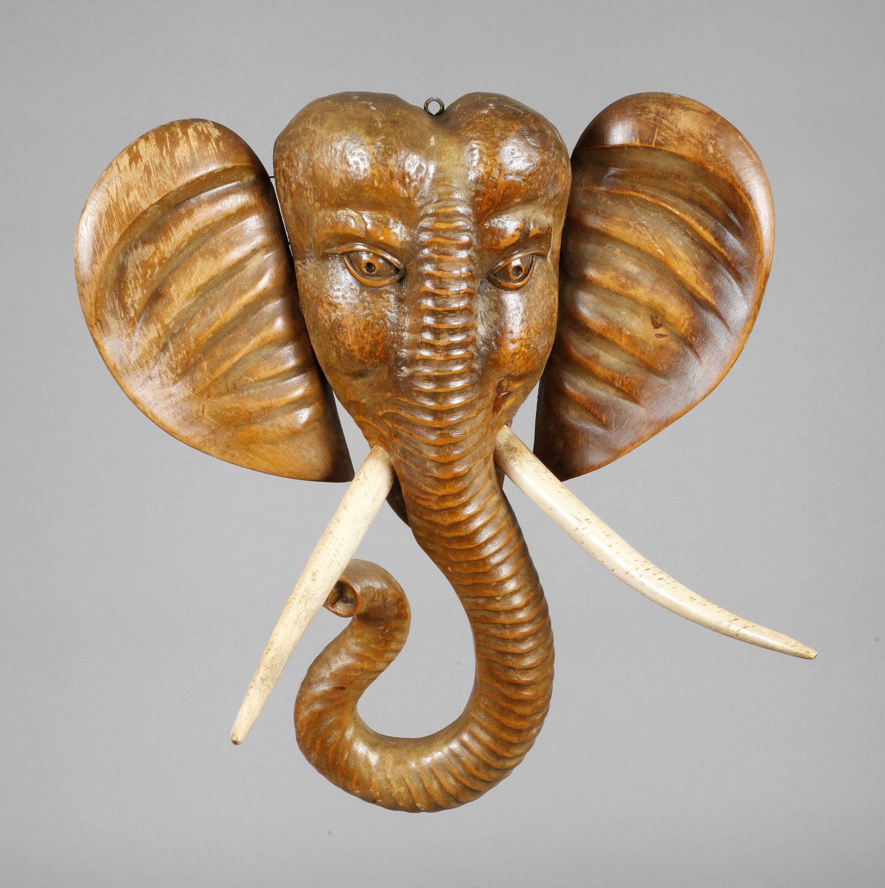 1. H. 20. Jh., Holz geschnitzt und bräunlich gefasst, dreiteilig gefertigtes Elefantenhaupt mit eingesteckten Stoßzähnen aus Bein, eine best., H ca. 50 cm.