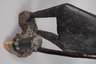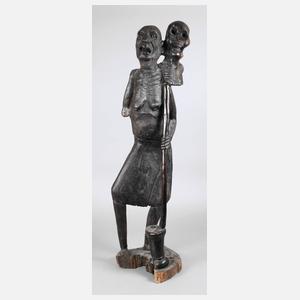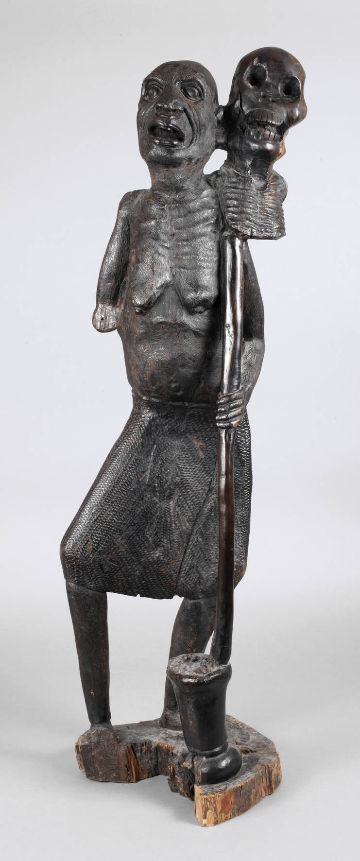 Tansania / Mosambik, 20. Jh., aus einem Stück Ebenholz gefertigt, ausdrucksstarke Darstellung einer an einem Mörser stehenden, ausgezehrten Greisin, den Tod auf der Schulter tragend, kahles, faltiges Haupt und gravierter Nasenring, knöcherner Leib, Rock mit fein gravierter Musterung, meisterliche und detailreiche Arbeit, linker Unterarm, Fuß und Teile der Bodenplatte fehlen, Altersspuren, H 107 cm.