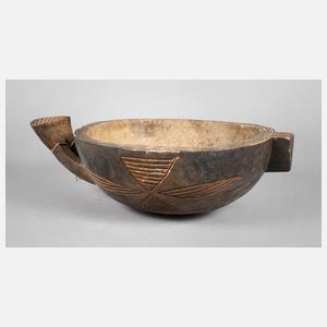 20. Jh., helles Tropenholz, halbrund geschnitzt, mit Griffstück, teilweise gefärbt und mit Kerbschnitzerei verziert, Altersspuren und kleine Substanzverluste, D ca. 31 cm.