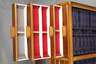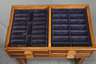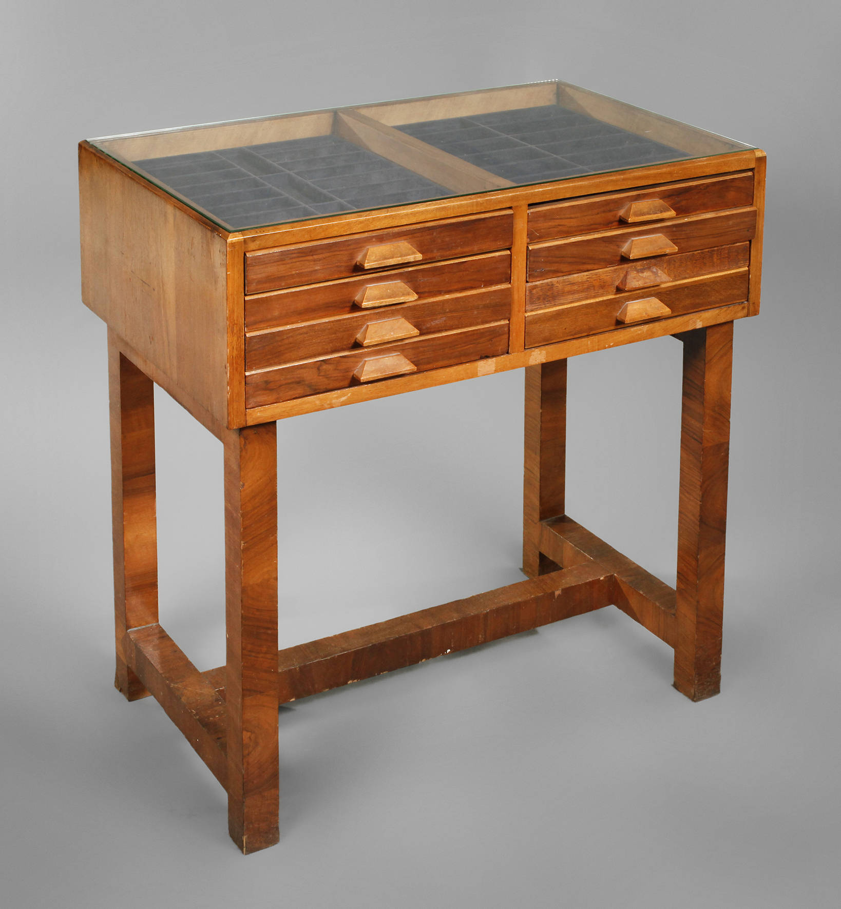 um 1930, aus einem Juweliergeschäft, Nussbaum massiv, mit Glasplatte und sieben darunter liegenden Schüben, diese unterteilt und mit Samt ausgeschlagen, Maße 80 x 80 x 51 cm.