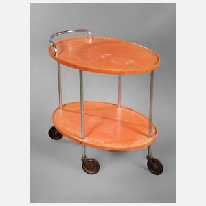 deutsch, 1930er Jahre, Gestell aus verchromtem Stahlrohr, ovale Platte aus Schichtholz orangerot lackiert, auf Rädern gelagert, Originallack etwas verblasst, Platte mit Flecken, Maße 73 x 68 x 45 cm.