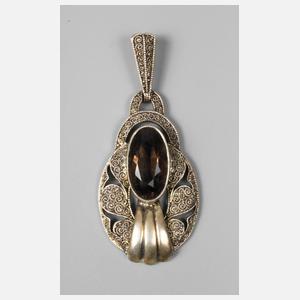 um 1930, Silber gestempelt 925, vergoldet, durchbrochen gearbeitet, belegt mit feinem Spiraldraht, mittig besetzt mit ovalem facettierten Rauchquarz, rückseitig Stempelmarke „Original Fahrner“, Länge ca. 45 mm, Gewicht ca. 5,6 g.