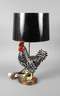 um 1950, Messinggestell mit großem vollplastisch gearbeitetem Gockel aus farbig glasiertem Porzellan, einflammig elektr., Altersspuren, H 80 cm.