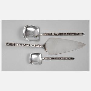 2. Hälfte 20. Jh., wohl Mexiko, gestempelt 800, Tortenschaufel und zwei Löffel, die Griffe unregelmäßig reliefiert, L max. 21 cm, G ca. 81 g.