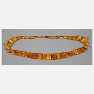 2. Hälfte 20. Jh., einzeln geknotet, milchige und klare Steine, im Mittelteil kissenförmig geschliffen, Größe max. 25 x 16 mm, Federringverschluss, Länge 64 cm, Gewicht ca. 69 g.