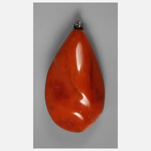 1. Hälfte 20. Jh., Aufhängung Silber geprüft, tropfenförmiger, unregelmäßig geschliffener Bernstein von dunkeloranger Farbe, Länge 75 mm, Gewicht ca. 26 g.