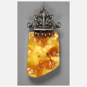 2. Hälfte 20. Jh., Metall versilbert, Aufhängung als Filigranarbeit, Bernstein von lebhaften Farbenspiel, Länge gesamt 63 mm, Gewicht ca. 13,8 g.