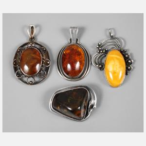 Mitte 20. Jh., drei Teile Silber, einmal versilbert, drei Anhänger, eine Brosche, besetzt mit je einem Bernstein, Gesamtgewicht ca. 26,4 g.