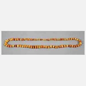 Mitte 20. Jh., einzeln geknotet, unregelmäßig geschliffen, im Verlauf von 14 auf 8 mm, mit Schraubverschluss, Länge 78 cm, Gewicht ca. 50 g.