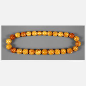 1. Hälfte 20. Jh., trübe, kräftig marmorierte Kugeln in verschiedenen Gelbtönen, im Verlauf von 17 auf 15 mm, Schraubverschluss zwischen zwei Kugeln, Länge 46 cm, Gewicht ca. 64 g.