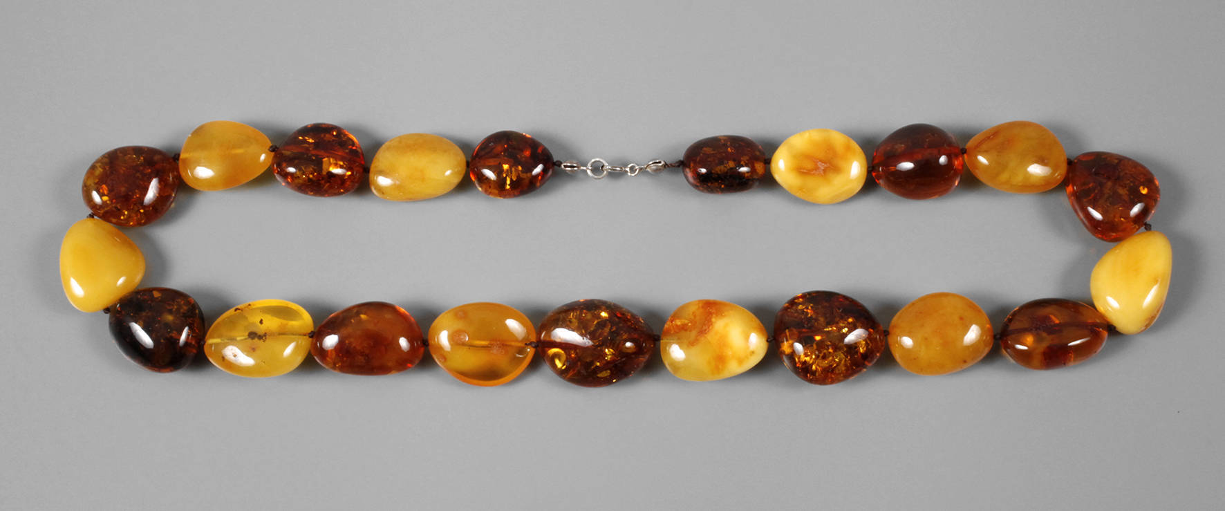 2. Hälfte 20. Jh., Ringverschluss Silber gestempelt 925, große unregelmäßig geschliffene Bernsteine in dunkelgelb/transparent und honiggelb/leicht durchscheinend, einzeln geknotet, Länge 52 cm, Gewicht 59 g.
