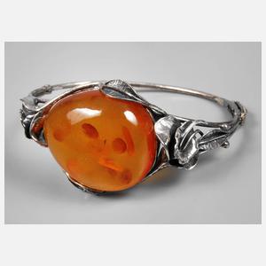 2. Hälfte 20. Jh., Silber geprüft, besetzt mit klarem, goldgelben Bernsteincabochon von ca. 32 x 29 mm, umgeben von Blüten und Rankenwerk, Verschluss mit Sicherheitsacht, Durchmesser max. 64 mm, Gewicht ca. 25,7 g.