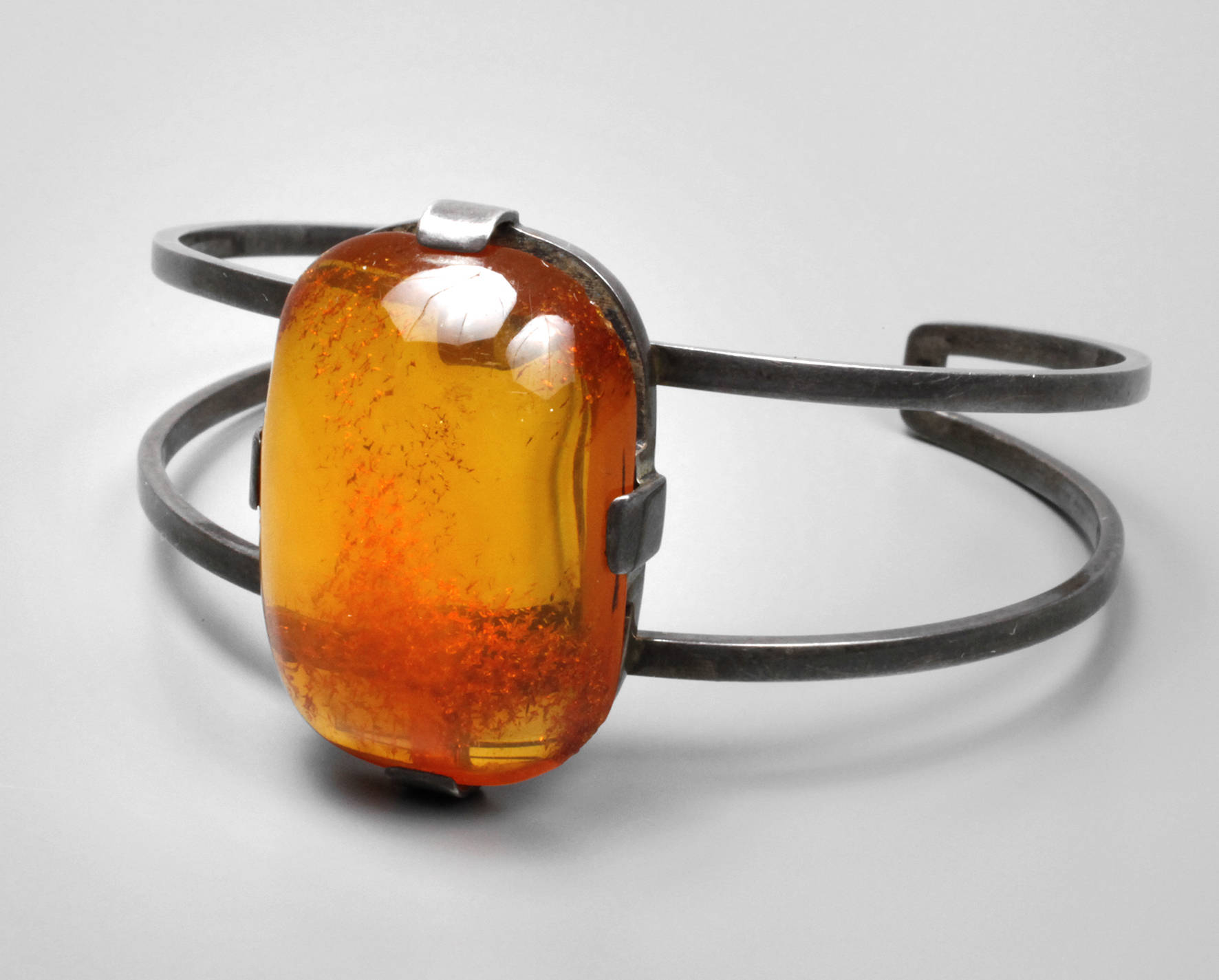 um 1930, Silber gestempelt „Sterling 925“ und „Hamburg Noblelle“, besetzt mit Bernsteincabochon von ca. 32 x 22 mm, Reifdurchmesser ca. 63 mm, Gewicht ca. 22,7 g.