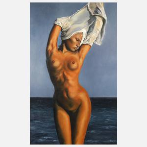 junge, sich entkleidende Frau am Meer, effektvolle, erotische Aktmalerei, Öl auf Hartfaser, um 1980, rechts unten signiert ”Kober”, rückseitig betitelt ”Mädchen am Strand – nach einem Foto eines unbekannten Autors”, kleiner Farbplatzer, gering reinigungsbedürftig, original gerahmt, Falzmaß ca. 82 x 52 cm. Künstlerinfo: eigentlich Paul Emil Kober, dt. Maler, Graphiker, Kunsterzieher und Laienschauspieler (1909 Treuen bis 1991 Treuen), 1952–74 Lehrer für Kunsterziehung in Treuen, regelmäßige Aufenthalte in der Sächsischen Schweiz, Mitglied im Verband Bildender Künstler (VBK) der DDR, tätig in Treuen im Vogtland, Quelle: Internet und Stadtanzeiger Treuen.