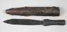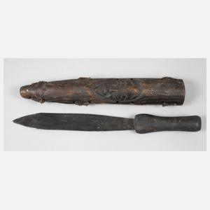 Neufertigung, Holzgriff mit Blechklinge, zweischalige, dunkel eingefärbte Holzscheide vorderseitig mit geschnitztem Gesicht verziert, Z 3, L ges. 42 cm.