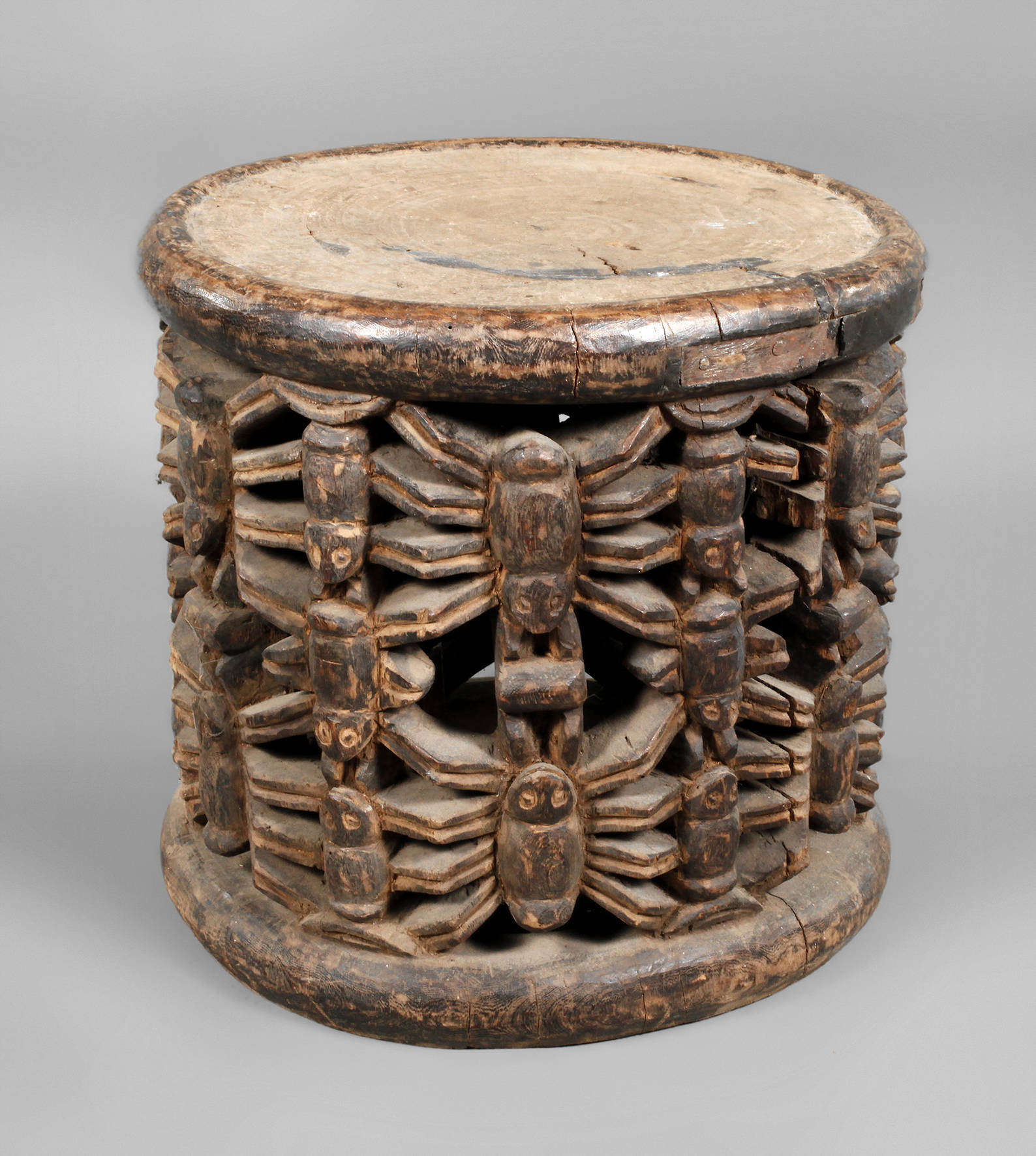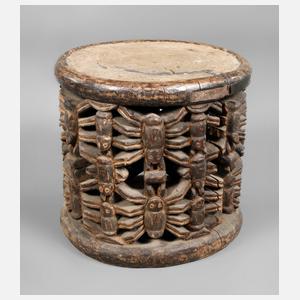 wohl Kameruner Grasland, 20. Jh., aus einem Stück Tropenholz gefertigt, hohl gearbeitet und allseitig mit Spinnenmotiven beschnitzt, gedunkelt und einige kleine Wurmlöcher, Alters- und Gebrauchsspuren, Z 2, H 39 cm, D ca. 40 cm.