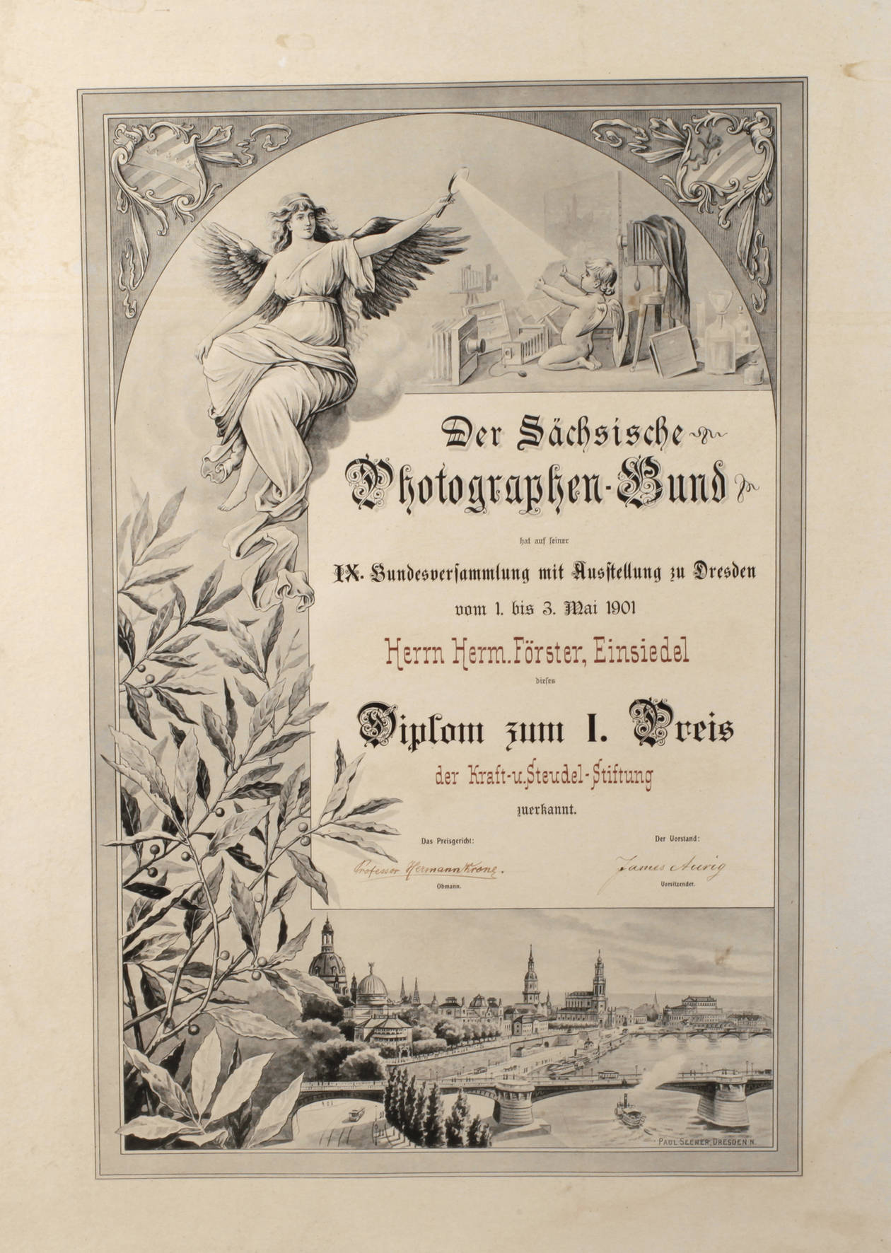 Verleihungsurkunde des Sächs. Photographen-Bund zum 1. Preis der Kraft- u. Steudel-Stiftung an Herm. Förster, Einsiedel, datiert Dresden, 1.–3. Mai 1901 sowie handschriftl. Signatur der Fotografen Prof. Hermann Krone und James Aurig, sehr dekorative Lithogr. mit Allegorie und Ansicht Dresdens nach einem Entwurf von Paul Seener, auf Trägerkarton aufgezogen, ungerahmt, min. fleckig, Blattmaß 63,5 x 48 cm. Künstlerinfo Hermann Krone: dt. Fotograf, Wissenschaftler, Hochschullehrer und Publizist (1827 in Breslau bis 1916 in Laubegast), gründete das Historische Lehrmuseum für Fotografie in Dresden, gilt als einer der bekanntesten Fotografen des 19. Jahrhunderts, Quelle: Internet.