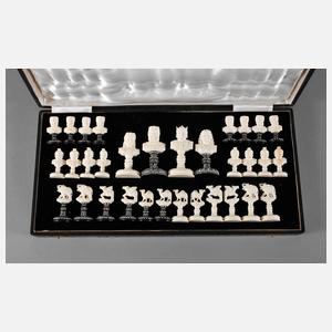 1. Hälfte 20. Jh., Elfenbein fein beschnitzt, teils graviert und farbig gefasst, mehrteilig gefertigte Spielfiguren auf ornamental verziertem Sockel, in orig. Schatulle, kpl., H König 9 cm.