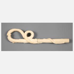 Ende 19. Jh., Elfenbein fein beschnitzt, in Form einer sich um einen Baumstamm windenden Schlange, zweiteilig gefertigtes Griffstück, min. trocknungsrissig, L 13 cm.