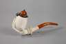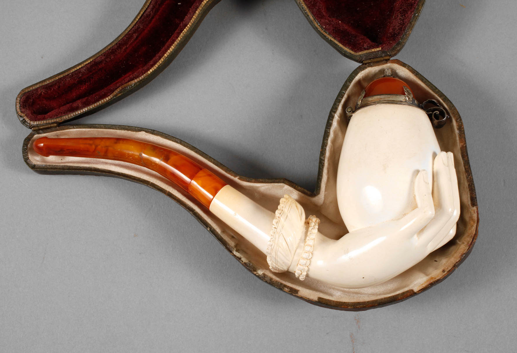 2. Hälfte 19. Jh., Etui gemarkt EM. Czapek Prag, naturalistisch geschnitzter Pfeifenkopf in Form einer Damenhand, mit Silbermontierung und Cabochon aus Pressbernstein, Bernsteinmundstück, dieses alt rep., Alters- und Gebrauchsspuren, L 18 cm.