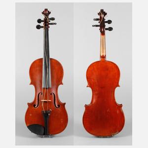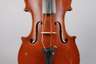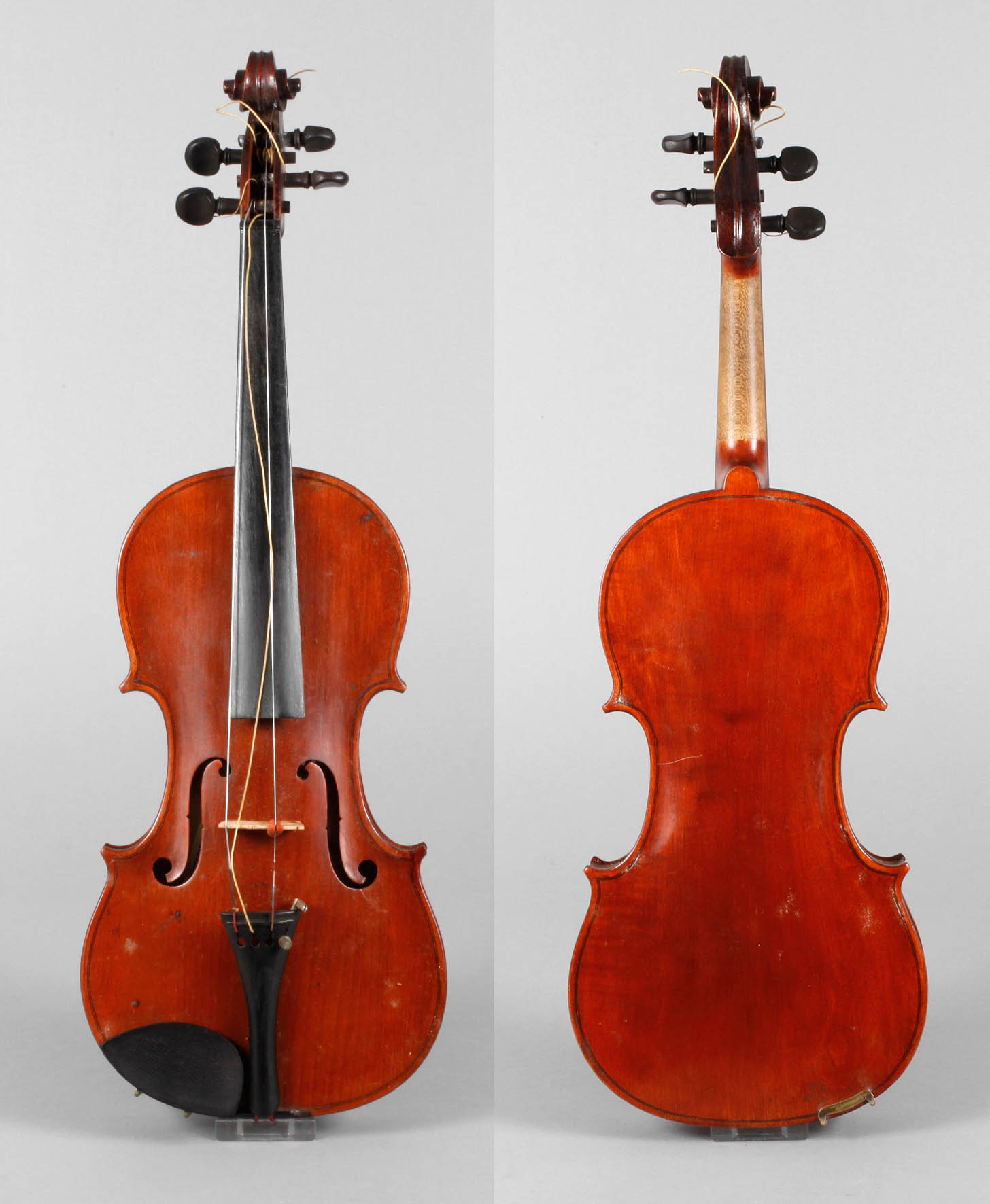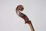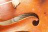 Mitte 20. Jh., innen mit Klebezettel bezeichnet Liuteria Artistica Vincenzo Miroglio & Figlio Catania, ungeteilter Boden in gleichmäßigem rotbraunen Lack, umlaufende dreiteilige Randeinlage, rissfreie Decke, Erhaltungsmängel, mit def. Bogen, L Korpus 35,7 cm.