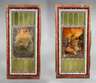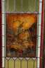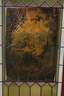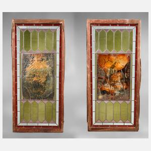 um 1890, Ornament und Buntglas mit geometrischem Motiv, mittig lithografiertes Landschaftsmotiv, im originalen Holzrahmen, vier kleine Randsegmente gerissen, Lithographie mit Trocknungsrissen, Maße je 103 x 456 cm.