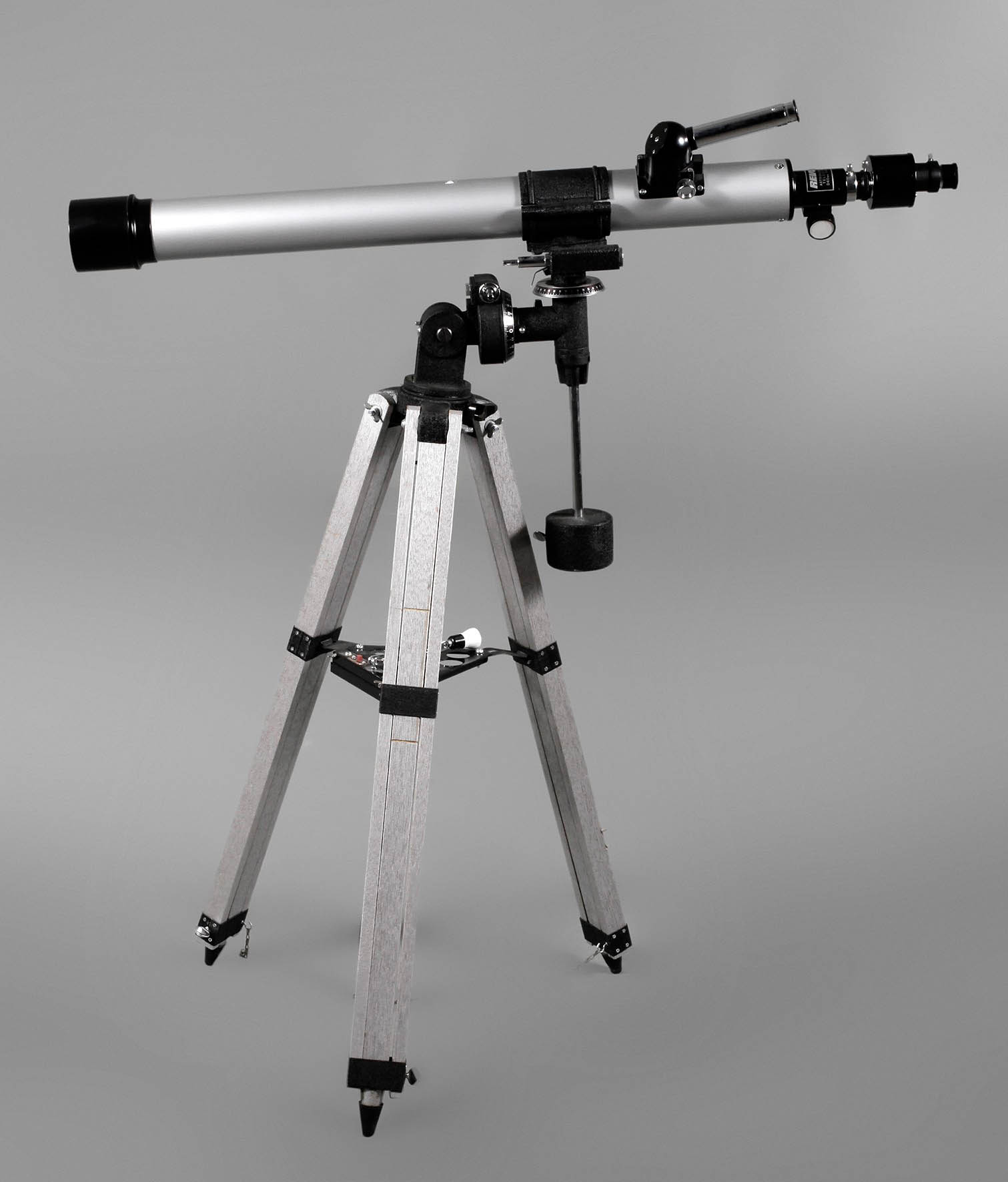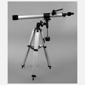 20. Jh., gemarkt Revue Astronomical Telescope sowie Angaben d = 60 mm und f = 910 mm, dreibeiniges, silberfarbenes Holzstativ mit Zwischenablage, verstellbares geschwärztes Eisengussgestell, mit Zubehör, H variabel.