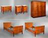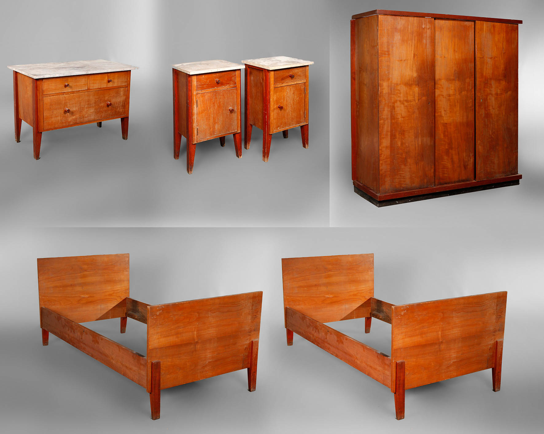 Erich Dieckmann um 1927-1929, für die Wohnung des Bauhäuslers Johannes Driesch, Hersteller Ehemalige Bauhochschule Weimar, bestehend aus dreitürigem Kleiderschrank, zwei Betten, zwei Nachttischen und einer Kommode, Kirschbaum furniert, Profilleisten, Beine und Beschläge rötlich gebeizt, Kleiderschrank zerlegbar, unberührter orig. Zustand mit Alters- und Gebrauchsspuren, rest.bed., Schloss des Schrankes aufgebrochen und ersetzt, Türinnenseite mit Resten eines Spiegels, Maße Schrank H 176 x B 167 x T 64 cm. Quelle: Erich Dieckmann Möbelbau, Die Baubücker Band 11, Julius Hoffmann Verlag Stuttgart, 1931, S. 16 (Bett), S. 83 (Schrank und Nachttischchen).