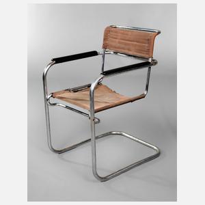 Entwurf Anton Lorenz Modell ”SS32” aus dem DESTA-Katalog, Ausführung um 1930, Stahlrohr verchromt, Armauflagen aus schwarzem Bakelit, originale braune Eisengarnbespannung, Chrom Z 2, Sitzfläche seitlich eingerissen, Bespannung der Lehne nachgenäht, Alters- und Gebrauchsspuren, H 84 cm x B 55 cm x T 56 cm. Literatur: Ein Stuhl macht Geschichte, Werner Möller, Otokar Mácel, 1992, S. 55, Abb. 82.